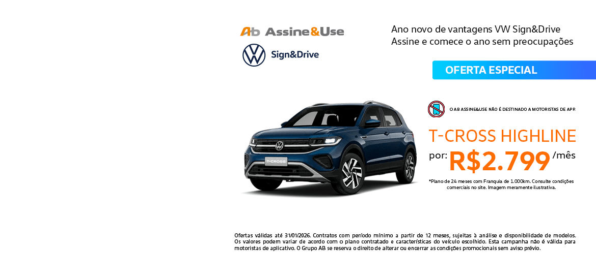 VW Sign And Drive: Oportunidade pra você ter um Volkswagen 0km com todas as praticidade de serviço de assinatura. Seu Volkswagen sem ter que se preocupar com seguro do veículo, documentação, emplacamento e manutenção. Seu contrato de aluguel, com uma franquia de quilometragem mensal pode ser de 12, 18 ou 24 meses.
